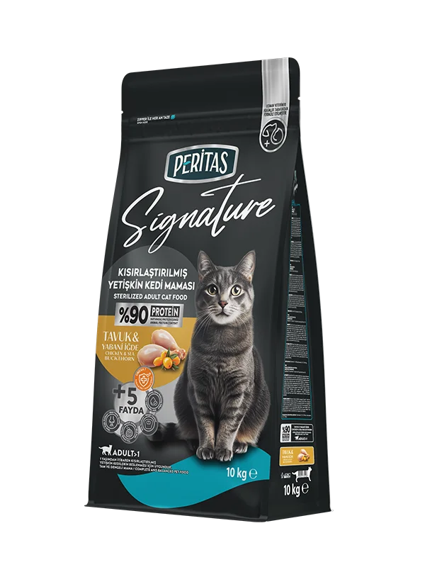 PERITAS Signature для взрослых стерилизованных кошек с курицей; это полнорационный и сбалансированный сухой корм с курицей и диким маслиником, разработанный для удовлетворения суточных потребностей кастрированных кошек.