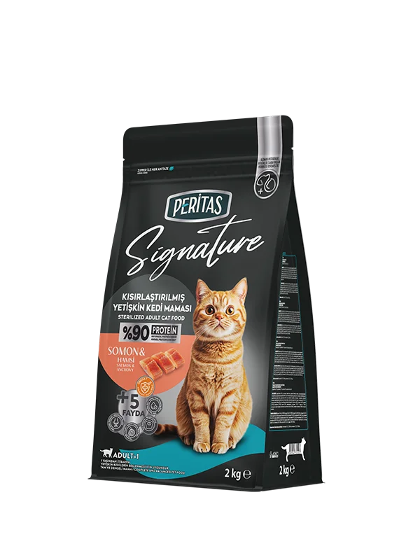 PERİTAS Signature Лосось & Анчоусы — Корм для стерилизованных кошек — это полноценный и сбалансированный сухой корм на основе лосося и анчоусов, разработанный для удовлетворения ежедневных потребностей стерилизованных кошек.