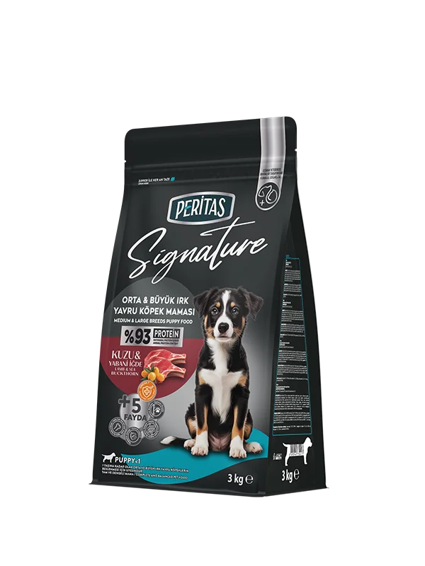 PERITAS Signature Корм для щенков средних и крупных пород с мясом ягнёнка — это полноценный и сбалансированный продукт, разработанный для удовлетворения ежедневных потребностей щенков средних и крупных пород. Содержит 93% животного белка. Обогащен функциональными растениями, витаминами и минералами, а также специальными питательными компонентами.