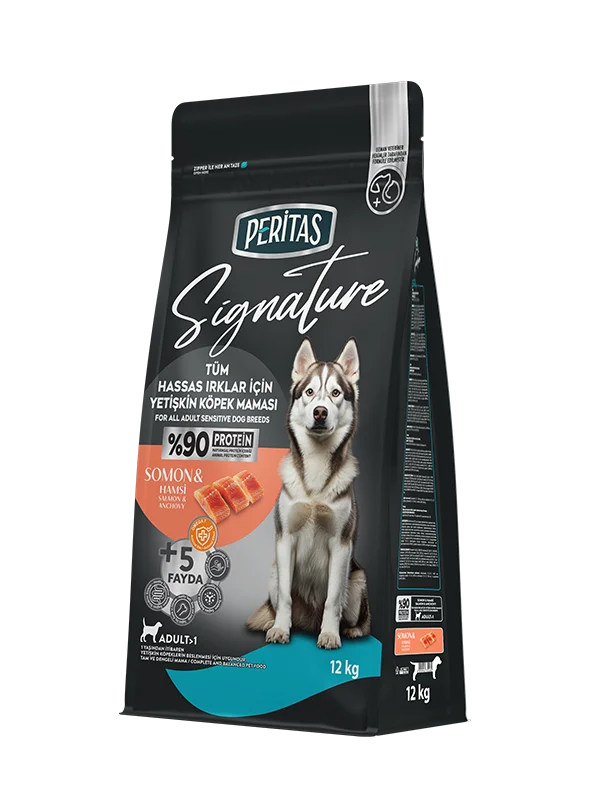 Peritas Signature – hrană uscată completă și echilibrată pentru câini adulți de toate rasele sensibile; este o hrană cu somon și anșoa, formulată pentru a satisface toate nevoile nutriționale ale câinelui adult, destinată raselor sensibile, predispuse la sensibilități ale pielii și blănii.